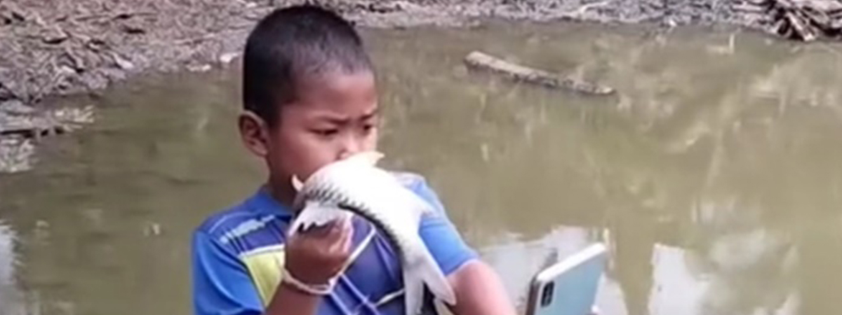 ผู้ใช้ TikTok @aek.9525 ได้เผยภาพหนูน้อยคนหนึ่ง จับปลามาได้และกำลังจะปล่อยกลับคืนสู่ธรรมชาติ ตอนแรกกะว่าจะโยนปลาลงน้ำ แต่สิ่งที่โยนไปนั้นเป็นโทรศัพท์มือถือ หันมาดูอีกทีก็คือปลายังอยู่ในมือ งานนี้ทำเอาเจ้าหนูวิ่งไปเก็บมือถือแทบไม่ทัน