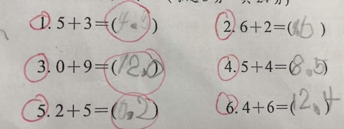 เฟซบุ๊กเพจ 爆料公社一日小編 ได้เผยภาพการบ้านวิชาคณิตศาสตร์ของนักเรียนชั้น ป.1 จากโจทย์ให้นักเรียนบวกลบเลขง่าย ๆ แต่นักเรียนคนนี้ใช้วิธีแก้โจทย์แบบอัจฉริยะ โดยใช้วิธีคิดเลขแบบจุดทศนิยม ถึงแม้จะเจ๋งแค่ไหน แค่ครูก็ตรวจคำตอบให้ผิดทุกข้อ แท้จริงให้แค่บวกลบเท่านั้น เนื่องจากนักเรียนเข้าใจผิด เอาเลขหน้าข้อไปคิดเลข เลยทำให้กลายเป็นจุดทศนิยมอย่างที่เห็น กระแสในโซเชียลหันมาชื่นชมนักเรียนคนนี้เป็นจำนวนมาก บอกว่านี่คือพรสวรรค์