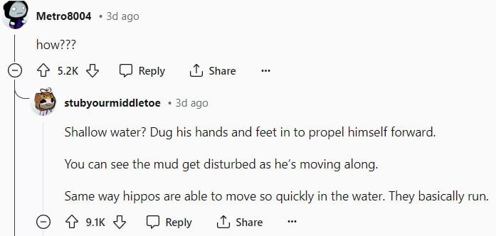 พอเห็นแบบนี้แล้วฝรั่งในคอมเมนต์ก็อึ้งไปตาม ๆ กัน เป็นไปได้ยังไงที่คนเราจะว่ายน้ำได้เร็วระดับนักกีฬาโอลิมปิกโดยกลั้นหายใจใต้น้ำได้นานขนาดนั้น และที่สำคัญคือเขาไม่แม้กระทั่งจะโผล่ขึ้นมาหายใจเลยด้วยซ้ำ บางคนถึงกับเรียกชายคนนี้ว่าเป็นมนุษย์ฮิปโป