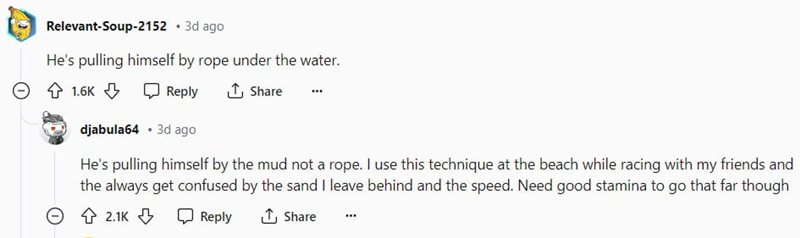 ในขณะเดียวกันก็มีคนแนะให้สังเกตว่า ขณะที่ชายคนนี้อยู่ใต้น้ำนั้น จะเห็นว่ามีดินสีดำลอยขึ้นมาเหนือน้ำ แสดงว่าน้ำตรงนั้นตื้นมากจนไม่ต้องว่าย และวิธีการเคลื่อนตัวในน้ำได้ไว อาจจะเป็นการใช้มือและเท้าวิ่งในน้ำและตะกุยดินขึ้นมาเหมือนฮิปโป ซึ่งฮิปโปไม่ได้ว่ายน้ำ แต่ใช้วิธีการวิ่งในน้ำแทน หรืออีกทางคือมีเชือกใต้น้ำ เขาอาจจะใช้วิธีการหาเชือกและไต่ไปตามเชือกจนถึงขอบสระอีกฝั่ง ซึ่งในความเป็นจริงนั้น การที่สามารถกลั้นหายใจและอยู่ใต้น้ำได้นาน จะทำให้เราเคลื่อนที่ได้ไวกว่าการขึ้นมาบนน้ำ
