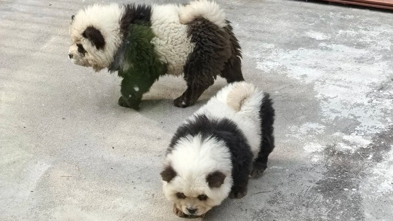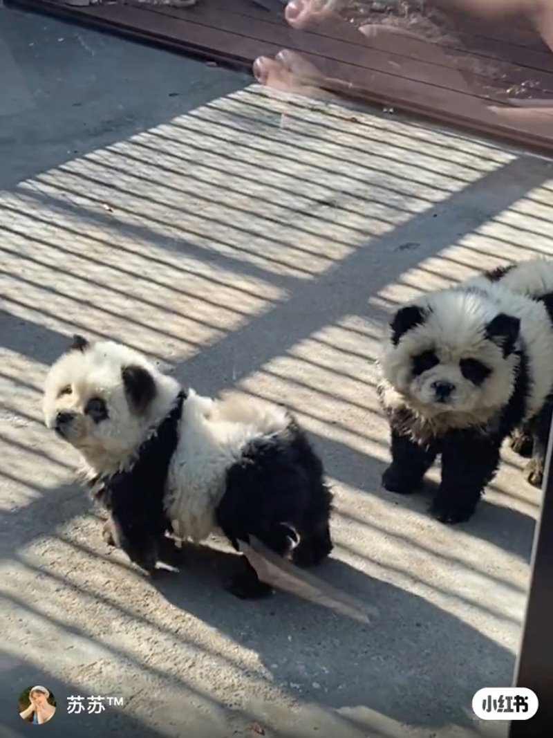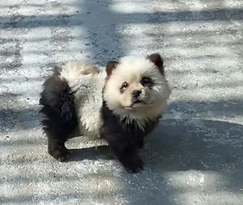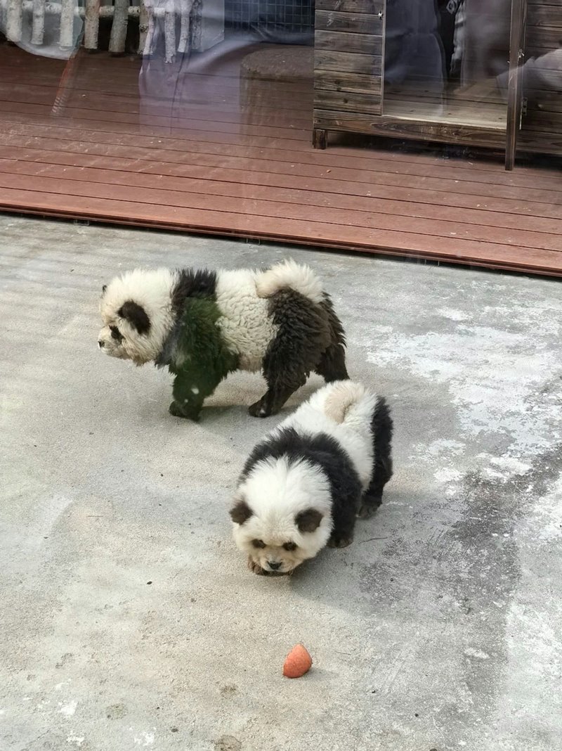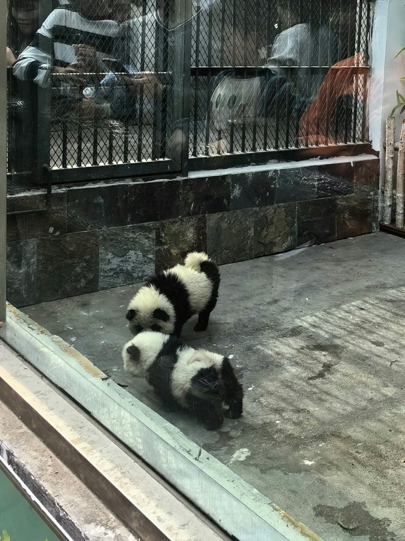 สำหรับหมาแพนด้าดังกล่าว เป็นเจ้าตูบเชาเชาตัวเล็ก 2 ตัว ที่ถูกนำมาย้อมสีขาว-ดำ และตัดขนจนดูเหมือนกับหมีแพนด้า จริงอยู่ที่การแฝงตัวเป็นแพนด้าของพวกมันไม่อาจหลอกสายตาคนดูได้ แต่ด้วยความน่ารักแบบเกินต้าน ก็ทำให้พวกมันกลายมาเป็นขวัญใจของนักท่องเที่ยว จนมีคนมาต่อคิวรอดูหมาแพนด้ากันยาวเหยียดตั้งแต่เช้าจนถึงเย็น