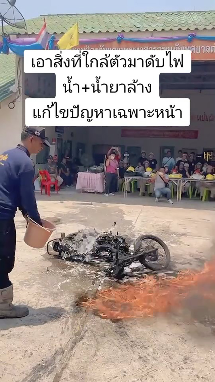 จากคลิปเป็นการจำลองสถานการณ์ ที่รถจักรยานยนต์ มีน้ำมันรั่วออกมา ก่อนจะติดไฟลุกไหม้รอบ ๆ บริเวณตัวรถ ซึ่งกรณีนี้สามารถดับไฟได้ด้วยการใช้ น้ำเปล่าผสมกับน้ำยาล้างจาน เมื่อผสมกันแล้วให้สังเกตทิศทางลมด้วย จากนั้นจึงสาดน้ำดังกล่าวลงไปเพื่อดับไฟที่เกิดขึ้น