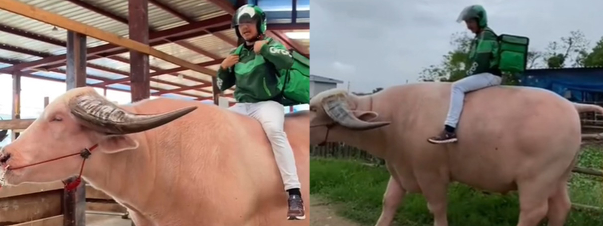 ผู้ใช้ TikTok @jayvanasuwan ได้เผยภาพไรเดอร์หนุ่มท่านหนึ่ง คิดค้นในการส่งอาหารแบบใหม่ ขี่มอเตอร์ไซค์มันธรรมดาไป เลยใช้วิถีชาวบ้าน ด้วยการขี่ควายเผือกไปส่งอาหารให้ลูกค้า แถมควายเผือกที่ขี่มีราคาสูงถึง 18 ล้านบาทเลยทีเดียว ชาวเน็ตพากันเอ็นดูไม่ไหว