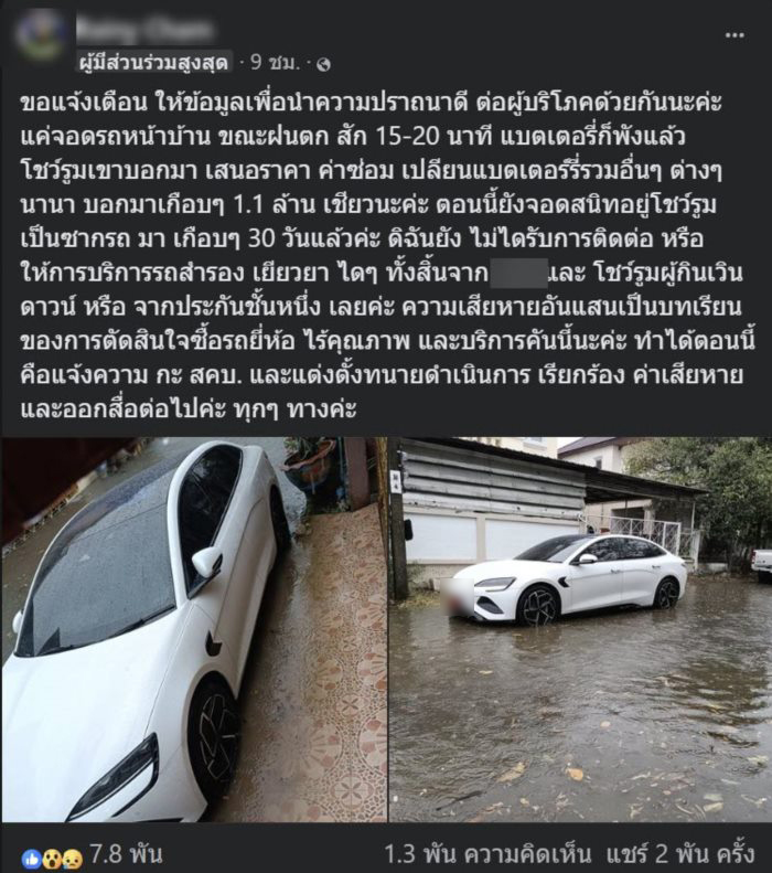 เจ้าของโพสต์ระบุว่า ขอแจ้งเตือนให้ข้อมูลเพื่อนำความปราถนาดีต่อผู้บริโภคด้วยกัน แค่จอดรถหน้าบ้าน ขณะฝนตก สัก 15-20 นาที แบตเตอรี่ก็พังแล้ว โชว์รูมเขาบอกมา เสนอราคา ค่าซ่อม เปลี่ยนแบตเตอร์รี่รวมอื่น ๆ ต่าง ๆ นานา บอกมาเกือบ ๆ 1.1 ล้าน ตอนนี้ยังจอดสนิทอยู่โชว์รูม เป็นซากรถ มา เกือบ ๆ 30 วันแล้ว ดิฉันยังไม่ไดรับการติดต่อ หรือให้การบริการรถสำรอง เยียวยา ใด ๆ ทั้งสิ้นจากตัวแทนและโชว์รูม หรือจากประกันชั้นหนึ่งเลย