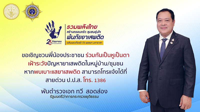 เนื่องในโอกาสวันต่อต้านยาเสพติดโลก (26 มิถุนายน) ประจำปี 2567 พันตำรวจเอก ทวี สอดส่อง รัฐมนตรีว่าการกระทรวงยุติธรรม เชิญชวนพี่น้องประชาชนร่วมเป็นส่วนหนึ่งในการแก้ไขปัญหายาเสพติด โดยร่วมกันเป็นหูเป็นตาเฝ้าระวังปัญหายาเสพติดในหมู่บ้าน/ชุมชน หากพบเบาะแสยาเสพติดสามารถโทร. แจ้งได้ที่ สายด่วน ป.ป.ส. โทร. 1386