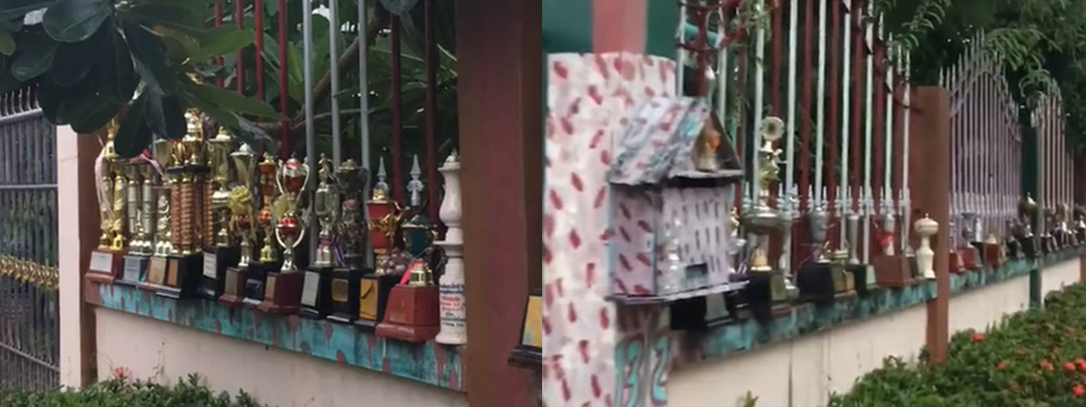 อวดให้รู้ไปเลยว่าพ่อเก่ง เมื่อพ่อเอาถ้วยรางวัล วางเรียงรอบกำแพงบ้าน ลูกแทบกุมขมับ
