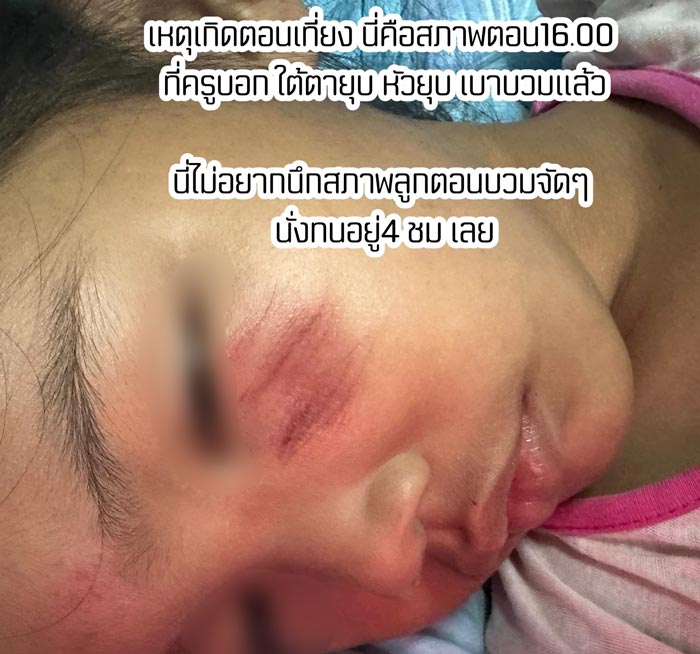 เจ้าของโพสต์ระบุว่า กลับมาหาลูก 6 โมงเย็น เจอลูกสภาพนี้ ลูกอายุ 4 ขวบครึ่ง หน้าบวมฉึ่ง หัวปูดตาปิด ใต้ตาบวม ยายบอกตอนมาจากโรงเรียนคือตาบวมแทบปิด หน้าผากโนเป็นลูกมะกรูด ตอนนี้ยุบลงแต่ก็ยังโนตามรูป