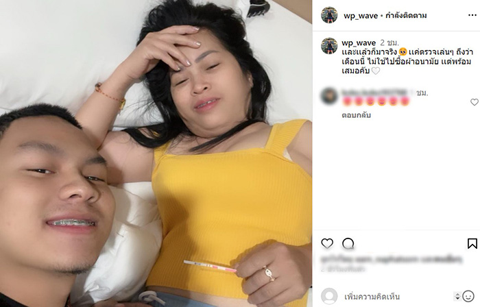 น้องเวฟ รักต่างวัย ประกาศข่าวดี พี่เล็ก แฟนคนปัจจุบัน ท้องแล้ว โชว์ภาพคู่พร้อมที่ตรวจครรภ์ขึ้น 2 ขีด แซวเดือนนี้ไม่ใช้ไปซื้อผ้าอนามัยเพราะแบบนี้เอง
