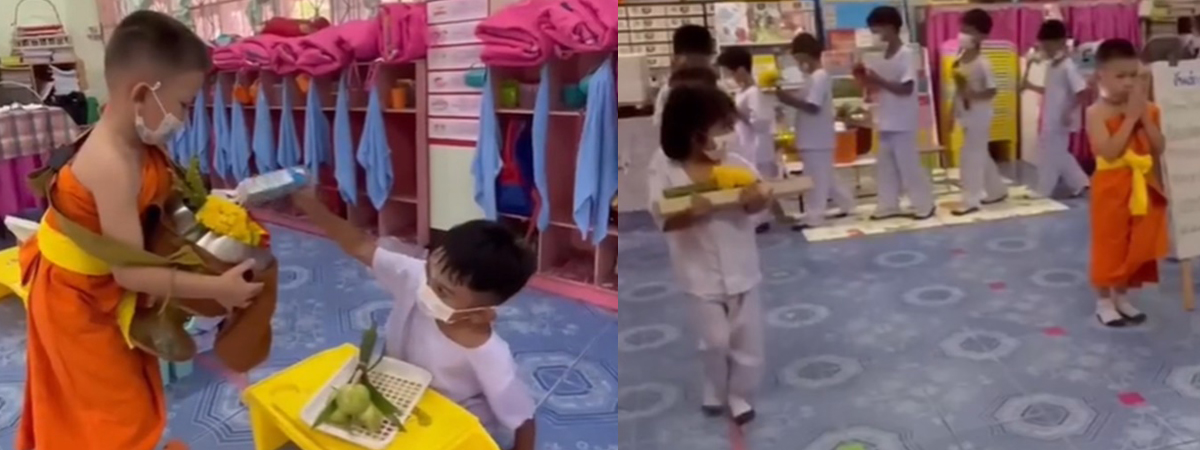 ผู้ใช้ TikTok @_qnrff ได้เผยภาพคุณครูได้จัดกิจกรรมเสริมประสบการณ์ ให้กับหนูน้อยนักเรียนอนุบาล โดยจำลองเหตุการณ์วันเข้าพรรษา เพื่อความสมจริงยิ่งขึ้น เด็กรับบทเป็นพระ พร้อมมีญาติโยมรอใส่บาตร ชาวเน็ตแห่ชื่นชม เป็นกิจกรรมที่ส่งเสริมเด็ก ๆ ได้ดีมาก