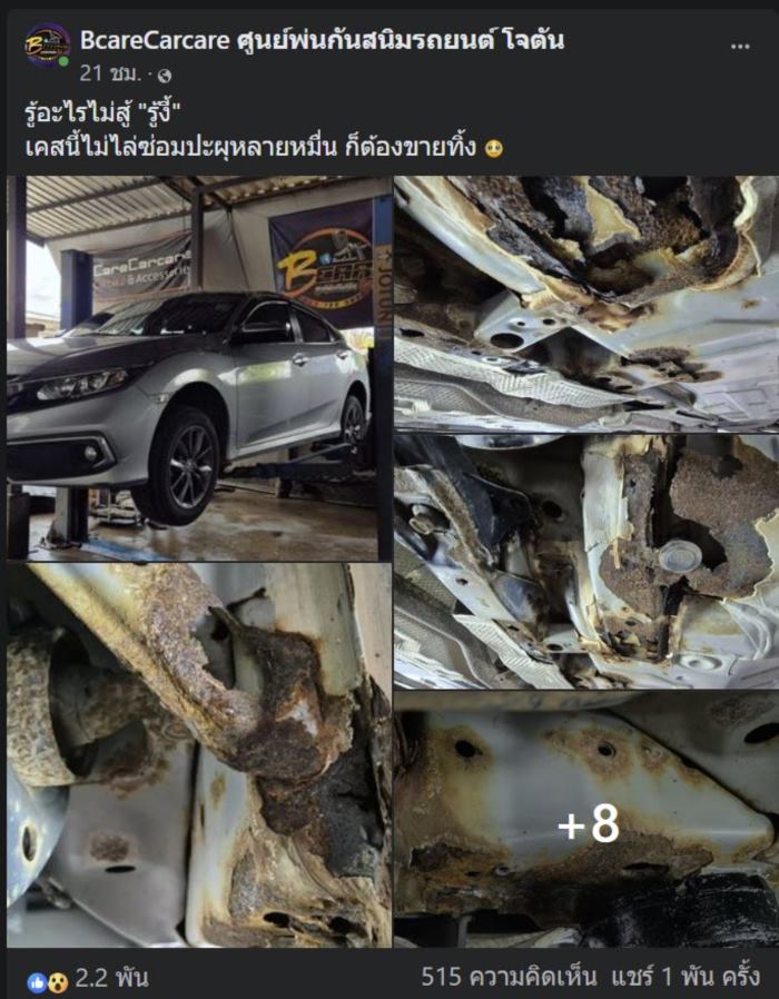 วันที่ 19 กรกฎาคม 2567 เพจเฟซบุ๊ก BcareCarcare ศูนย์พ่นกันสนิมรถยนต์ โจตัน เผยสภาพของของลูกค้าที่นำเข้ามาพ่นกันสนิม ซึ่งดูจากภายนอกรถยังคงใหม่มีสภาพใหม่เอี่ยม แต่แท้จริงแล้วรถคันนี้มีปัญหาใหญ่ที่ซุกซ่อนไว้จนยากที่จะแก้ไข