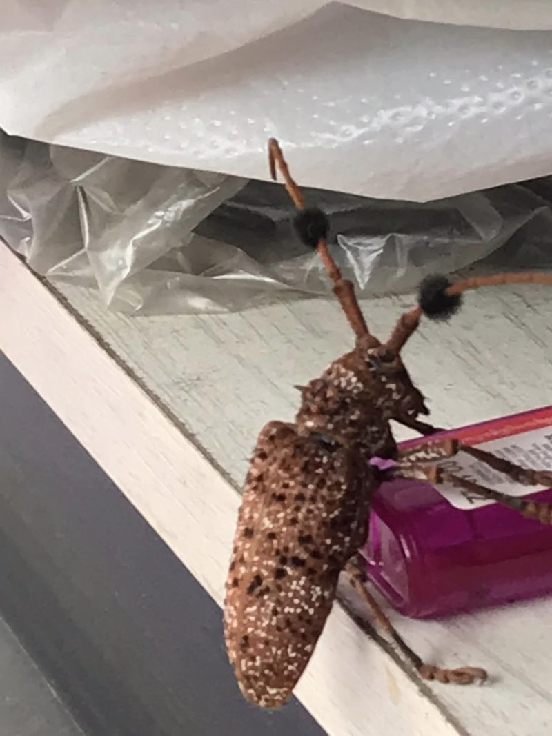 วันที่ 26 กรกฎาคม 2567 ผู้ใช้เฟซบุ๊กรายหนึ่ง โพสต์ในกลุ่ม นี่ตัวอะไร เป็นภาพของแมลงปริศนาสุดโดดเด่น ตัวสีน้ำตาล แต่มีไฮไลต์อยู่ที่ผิวหนังมีจุดสีดำสลับขาว เป็นจุดเล็ก ๆ จนดูระยิบระยับ นอกจากนี้ยังมีเขายาว และมีขนกลม ๆ สีดำกลางเขาอีกด้วย