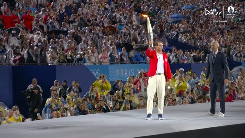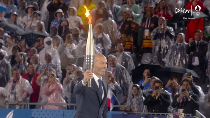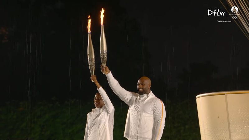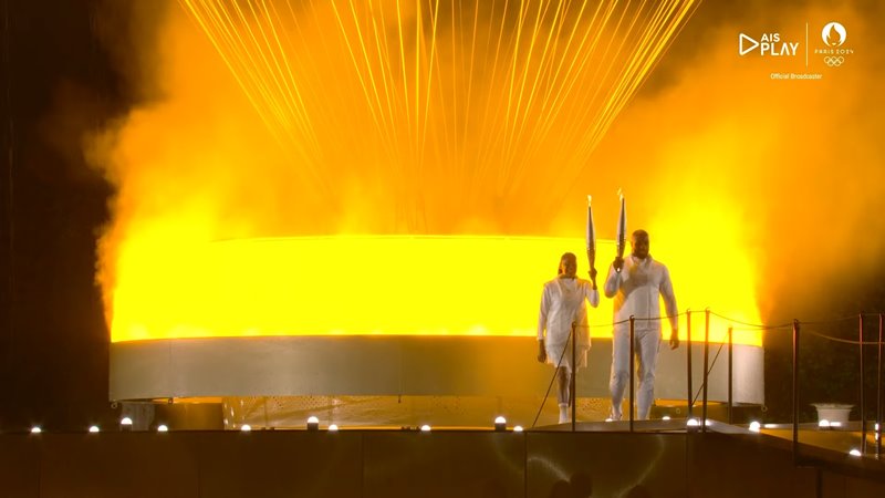 ขณะเดียวกัน ในพิธีเปิดส่วนอื่น ๆ เช่นพิธีจุดคบเพลิง เริ่มจุดกันที่หน้าหอไอเฟล มีซีเนดีน ซีดาน อดีตนักฟุตบอลทีมชาติฝรั่งเศสชุดแชมป์โลก ถือคบเพลิงเป็นคนแรก ส่งต่อให้ราฟาเอล นาดาล นักเทนนิสเจ้าของเหรียญทองโอลิมปิก 2 สมัย ก่อนส่งต่อคบเพลิงไปเรื่อย ๆ จนไปจุดคบเพลิงที่บอลลูนลอยฟ้า ฝีมือของเท็ดดี้ ริเนอร์ นักกีฬายูโด วัย 35 ปี และ มารี-โชเซ เปเรช นักวิ่งเจ้าของ 3 เหรียญทองวัย 56 ปี และเมื่อคบเพลิงถูกจุดขึ้นที่นี่ ก็เท่ากับว่า การแข่งขันโอลิมปิก 2024 ได้เริ่มขึ้นอย่างเป็นทางการ