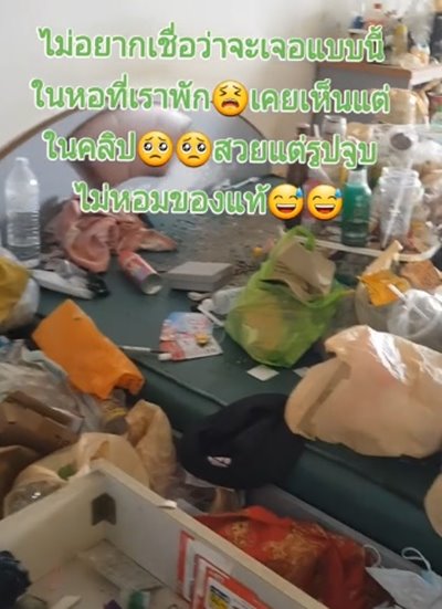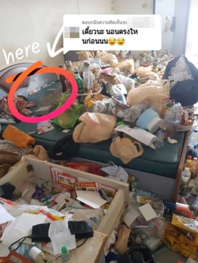 ขณะเดียวกันชาวเน็ตเมื่อเห็นภาพนี้ต่างสงสัยว่า แล้วคนในห้องนอนกันที่ไหน ขยะเต็มทั้งบนพื้น ทั้งเตียง ก่อนที่เจ้าของคลิปจะมาเฉลยว่า จุดที่นอนคือตรงหัวเตียงแคบ ๆ นอนพาดขวาง สังเกตได้จากตรงจุดนั้นไม่มีขยะวางอยู่ ส่วนเรื่องการเดินไปเข้าห้องน้ำ คงใช้การกระโดดข้ามเอา เพราะไม่มีช่องว่างสำหรับทางเดินเลย