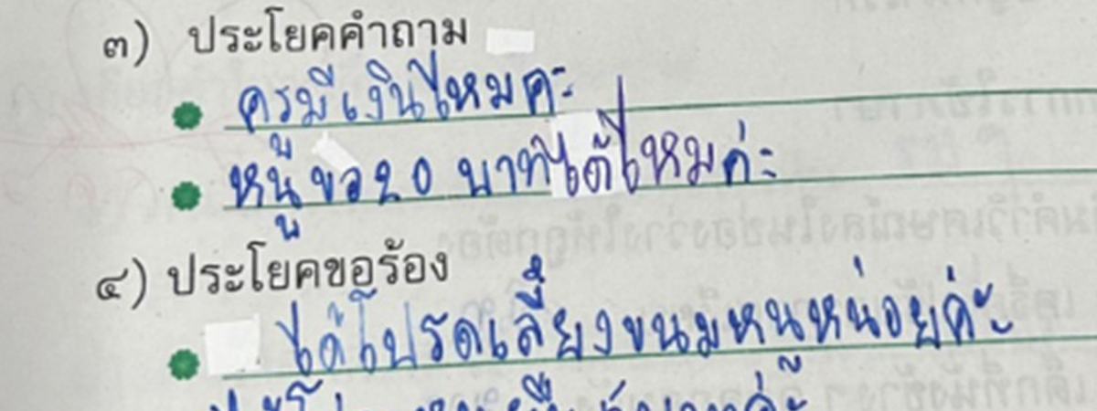 ผู้ใช้ TikTok @tiktoktawann ได้เผยภาพครูตรวจการบ้านแต่งประโยค ที่นักเรียนทำส่งในคาบ กำหนดโจทย์ให้นักเรียนแต่งประโยคตามที่บอก ตรวจทีละข้อ ก็ยิ่งเห็นความพีคขึ้นเรื่อย ๆ แต่งมาแต่ละประโยค ทำเอาครูตรวจต่อไม่ได้เลยทีเดียว ทั้งขำและเอ็นดูไม่ไหว