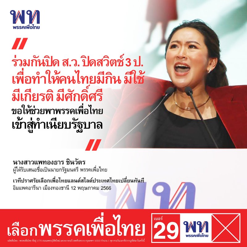 6. อุ๊งอิ๊ง แพทองธาร เป็นแคนดิเดตนายกรัฐมนตรีพรรคเพื่อไทย ร่วมกับนายเศรษฐา ทวีสิน และนายชัยเกษม นิติสิริ ในการเลือกตั้งทั่วไปปี 2566