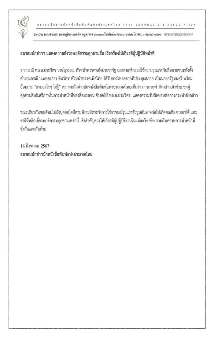 "สมาคมนักข่าวนักหนังสือพิมพ์แห่งประเทศไทยเห็นว่า การกระทำดังกล่าวเข้าข่าย ข่มขู่ คุกคามสิทธิเสรีภาพในการทำหน้าที่ของสื่อมวลชน จึงขอให้ พล.อ. ประวิตร แสดงความรับผิดชอบต่อการกระทำดังกล่าว