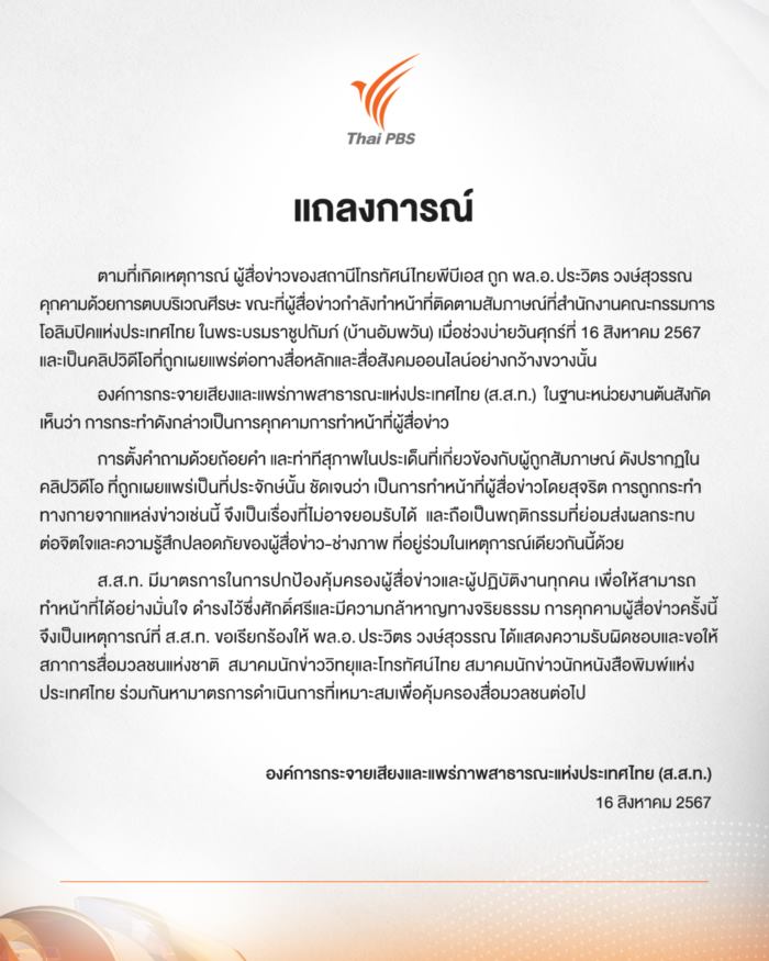 "องค์การกระจายเสียงและแพร่ภาพสาธารณะแห่งประเทศไทย (ส.ส.ท.) ในฐานะหน่วยงานต้นสังกัดเห็นว่า การกระทำดังกล่าวเป็นการคุกคามการทำหน้าที่ผู้สื่อข่าว