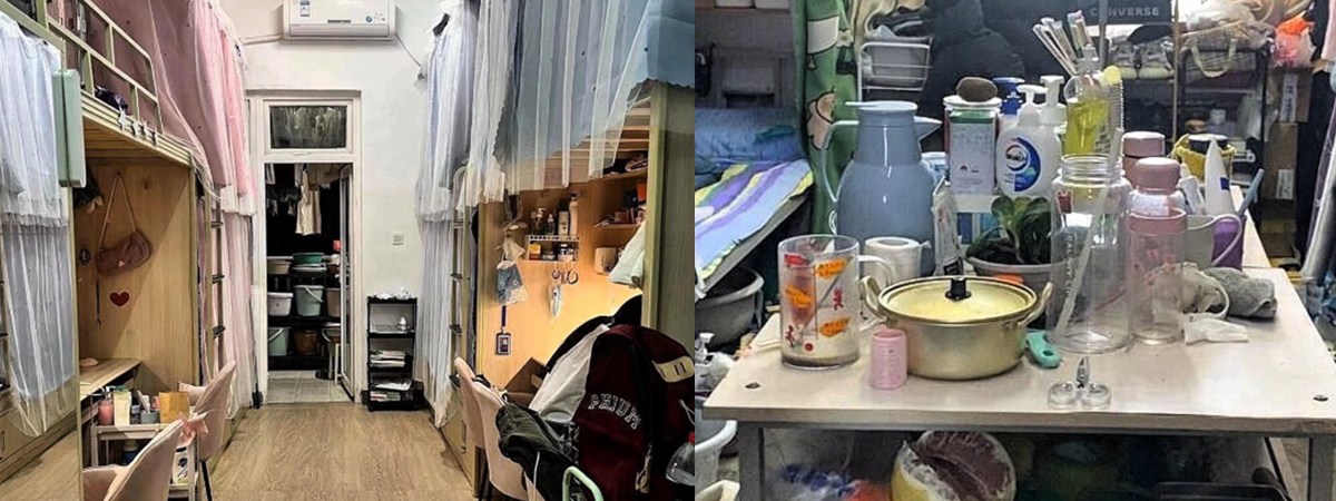 ผู้ใช้ TikTok @mttc159 ได้เผยภาพสาวไทยคนหนึ่ง พาดูหอพักนักศึกษาในประเทศจีน จากที่เห็นในซีรีส์ก็คือมีพื้นที่กว้างและสวยงาม ใช้ชีวิตกันอย่างสบาย แต่พอมาเห็นของจริง พื้นที่ค่อนข้างน้อย นอนรวมกัน 4-8 คน เตียงนอนข้างบน โต๊ะอ่านหนังสือข้างล่าง มีโต๊ะรวมตั้งของตรงกลางห้อง