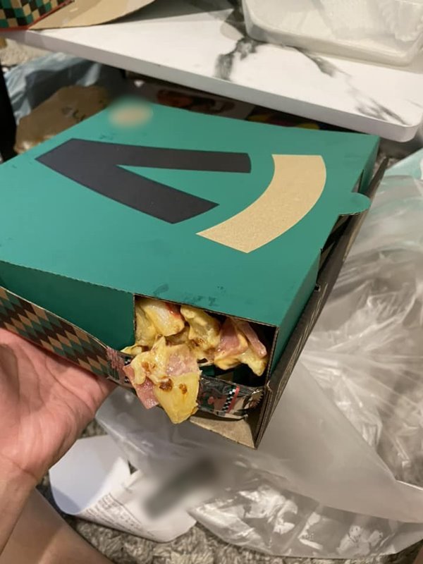 ได้ยินแค่นี้ก็ยังพอเข้าใจ เพราะระหว่างทางไรเดอร์อาจจะเจออุปสรรคทำให้อาหารได้รับความเสียหายเล็กน้อยได้ ทว่าเมื่อเปิดกล่องพิซซ่าออกมาต้องร้องว้าว หน้าเละนิดหน่อยจริงหรือ เพราะสภาพข้างในคือ หน้าพิซซ่าเละไม่มีชิ้นดี แถมเอียงไปกองอยู่ที่มุมหนึ่งของถาดเป็นที่เรียบร้อย