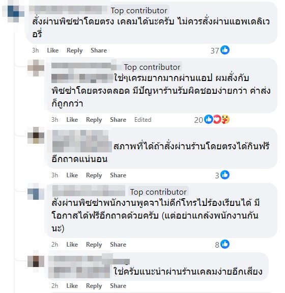 ด้านชาวเน็ตต่างเข้ามาแซวว่า นี่คือพิซซ่าหน้ารวมชัด ๆ บางคนก็เสนอว่า ถ้าหากสั่งกับร้านโดยตรง อย่างน้อยคือเคลมได้ ถ้าสั่งผ่านแอปฯ จะเคลมค่อนข้างยาก ส่วนคนที่ชอบสั่งผ่านแอปฯ จึงเข้ามาชี้แจงว่า ที่สั่งผ่านแอปฯ เพราะได้ส่วนลดมากกว่าสั่งผ่านร้าน