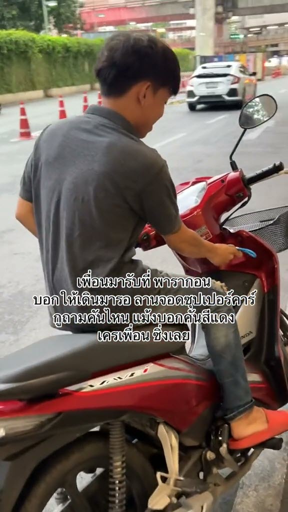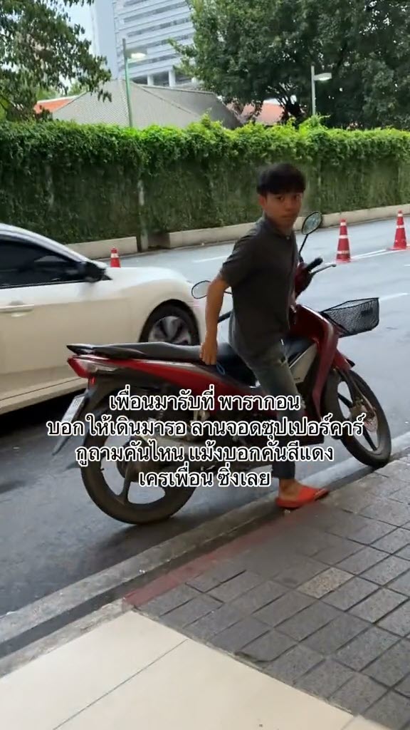 ปรากฏว่า เมื่อเดินออกมาตรงทางออกติดกับโซนดังกล่าวก็เจอเพื่อนมาจอดรอจริง ๆ ด้วยรถสีแดงตามที่บอก ไม่ใช่ซูเปอร์คาร์ แต่เป็นฮอนด้า เวฟ มอเตอร์ไซค์รุ่นยอดฮิตของหลาย ๆ บ้าน แถมยังมาด้วยลุครองเท้าแดงสุดจี๊ดอีกด้วย