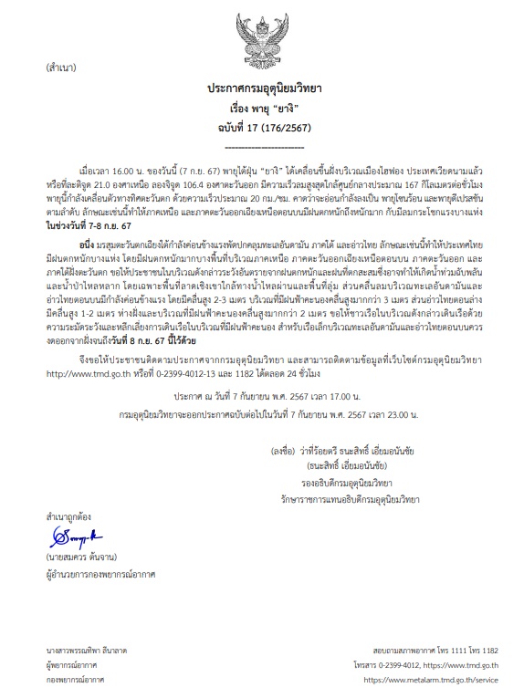 วันที่ 7 กันยายน 2567 เวลา 17.00 น. กรมอุตุนิยมวิทยา ออกประกาศเรื่อง