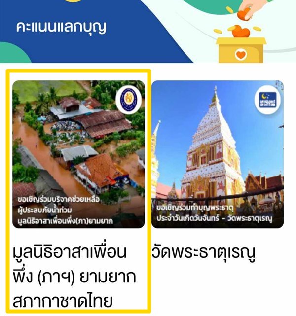 3. เลือกหัวข้อขอเชิญร่วมบริจาคช่วยเหลือผู้ประสบภัยน้ำท่วม มูลนิธิอาสาเพื่อนพึ่ง (ภาฯ) ยามยาก ซึ่งมียอดเงินให้บริจาค 3 ระดับ ได้แก่ 20 บาท, 50 บาท และ 100 บาท