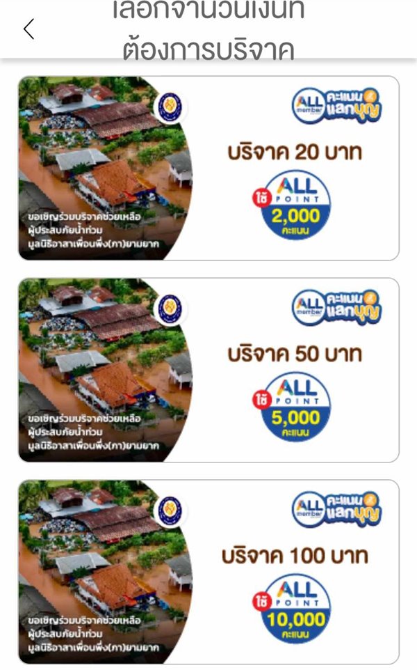 อยากช่วยน้ำท่วม แต่ไม่มีเงิน บริจาคด้วยแต้ม ALL Member ได้ ผ่านมูลนิธิอาสาเพื่อนพึ่ง (ภาฯ) ยามยาก ต้องทำยังไง ดูเลย