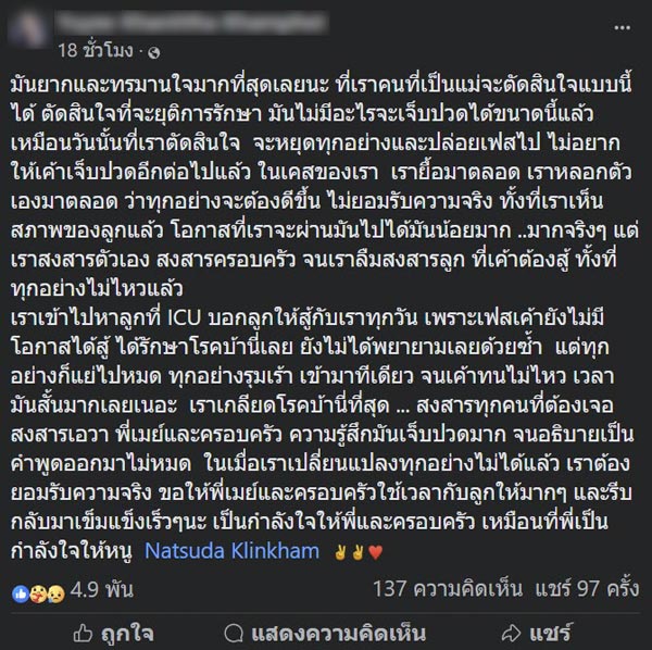 เราเข้าไปหาลูกที่ ICU บอกลูกให้สู้กับเราทุกวัน เพราะเฟสเขายังไม่มีโอกาสได้สู้ ได้รักษาโรคบ้านี่เลย ยังไม่ได้พยายามเลยด้วยซ้ำ แต่ทุกอย่างก็แย่ไปหมด ทุกอย่างรุมเร้าเข้ามาทีเดียว จนเขาทนไม่ไหว เวลามันสั้นมากเลยเนอะ เราเกลียดโรคบ้านี่ที่สุด สงสารทุกคนที่ต้องเจอ สงสารเอวา พี่เมย์ และครอบครัว ความรู้สึกมันเจ็บปวดมาก จนอธิบายเป็นคำพูดออกมาไม่หมด ในเมื่อเราเปลี่ยนแปลงทุกอย่างไม่ได้แล้ว เราต้องยอมรับความจริง ขอให้พี่เมย์และครอบครัวใช้เวลากับลูกให้มาก ๆ และรีบกลับมาเข้มแข็งเร็ว ๆ นะ เป็นกำลังใจให้พี่และครอบครัว เหมือนที่พี่เป็นกำลังใจให้หนู