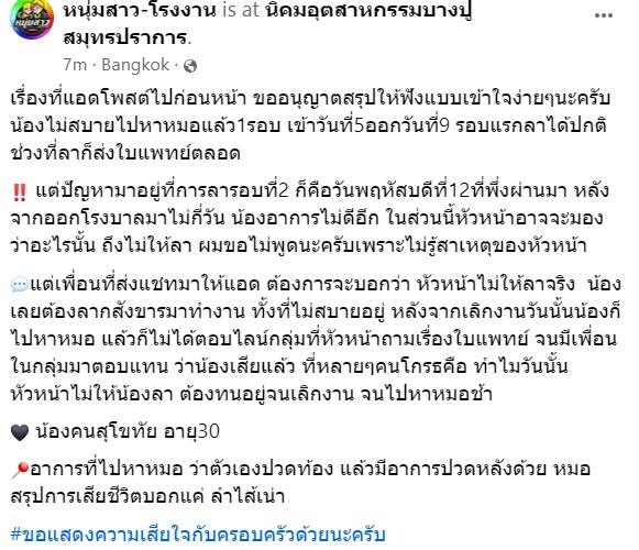 วันที่ 16 กันยายน 2567 เฟซบุ๊ก หนุ่มสาว-โรงงาน มีการโพสต์เล่าเรื่องราวพนักงานรายหนึ่งในบริษัทดัง นิคมบางปู จ.สมุทรปราการ มีอาการป่วยจนได้ลาหยุดไป อย่างไรก็ตาม อาการป่วยยังไม่หายดี จึงขอหัวหน้าลาเพิ่ม แต่หัวหน้าไม่ให้ลา จนพนักงานต้องมาทำงานทั้งที่ยังป่วย