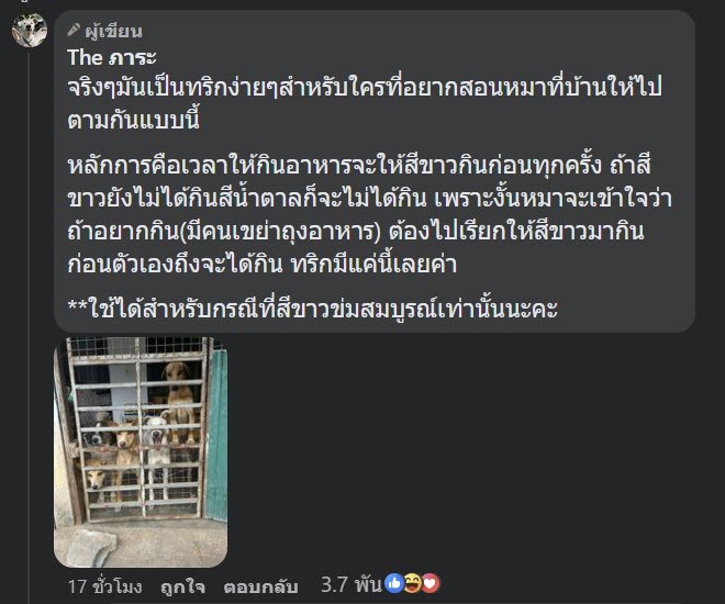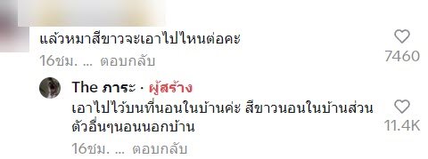 ต่อมา เจ้าของเพจเผยเบื้องลึกว่า ทำไมต้องยื่นให้เฉพาะหมาสีขาว เพราะว่าหมาสีขาวจะเอาไปไว้บนที่นอนในบ้าน หมาสีขาวนอนในบ้าน ส่วนตัวอื่น ๆ นอนนอกบ้าน