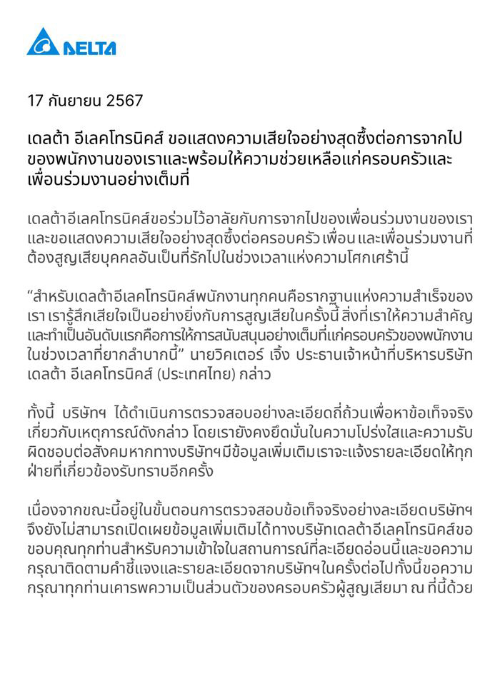 เนื่องจากขณะนี้อยู่ในขั้นตอนการตรวจสอบข้อเท็จจริงอย่างละเอียด บริษัทฯ จึงยังไม่สามารถเปิดเผยข้อมูลเพิ่มเติมได้ ทางบริษัทเดลต้า อีเลคโทรนิคส์ ขอขอบคุณทุกท่านสำหรับความเข้าใจในสถานการณ์ที่ละเอียดอ่อนนี้ และขอความกรุณาติดตามคำชี้แจงและรายละเอียดจากบริษัทฯ ในครั้งต่อไป ทั้งนี้ ขอความกรุณาทุกท่านเคารพความเป็นส่วนตัวของครอบครัวผู้สูญเสียมา ณ ที่นี้ด้วย