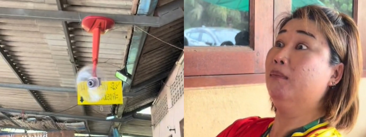 ผู้ใช้ TikTok @pongpong2542 ได้เผยภาพลูกค้าสาวกลุ่มหนึ่ง กำลังนั่งกินก๋วยเตี๋ยวที่ร้าน แล้วจังหวะนั้นดันไปสะดุดตาตรงพัดลมที่ร้านติดตั้ง เล่นใช้พัดลมตั้งโต๊ะแขวนเพดาน ห้อยหัวลงมาเลยทีเดียว แล้วไม่มีการใส่ตะแกรงกันใบพัดใด ๆ ทั้งสิ้น งานนี้ถึงกับนั่งอึ้งไปเลยทีเดียว