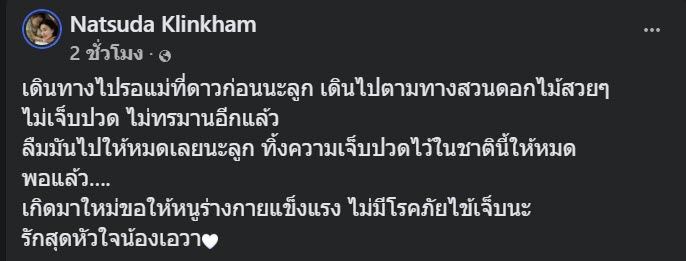 "เดินทางไปรอแม่ที่ดาวก่อนนะลูก เดินไปตามทางสวนดอกไม้สวย ๆ ไม่เจ็บปวด ไม่ทรมานอีกแล้ว ลืมมันไปให้หมดเลยนะลูก ทิ้งความเจ็บปวดไว้ในชาตินี้ให้หมด พอแล้ว…. เกิดมาใหม่ขอให้หนูร่างกายแข็งแรง ไม่มีโรคภัยไข้เจ็บนะ รักสุดหัวใจน้องเอวา"