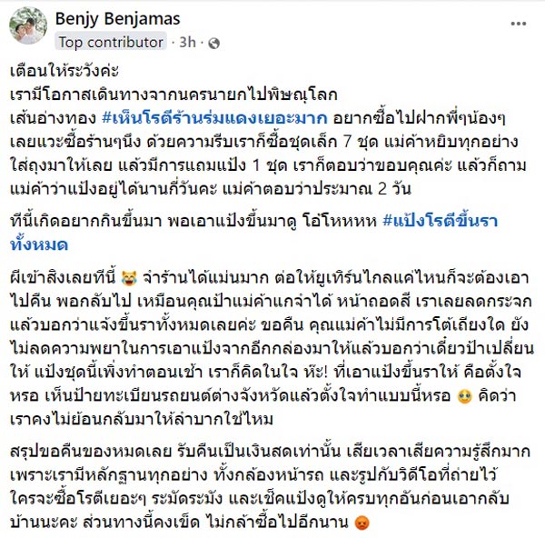 วันที่ 23 กันยายน 2567 เฟซบุ๊ก Benjy Benjamas มีการเล่าประสบการณ์การซื้อโรตีสายไหม แต่ถูกยัดไส้ด้วยของที่มีเชื้อรา เอาไปเปลี่ยนแทบไม่ทัน มีรายละเอียดดังนี้