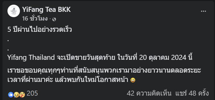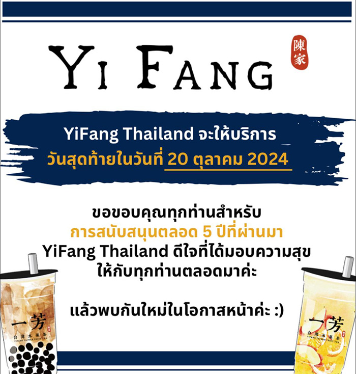 เพจเฟซบุ๊ก YiFang Tea BKK ระบุข้อความว่า "5 ปีผ่านไปอย่างรวดเร็ว Yifang Thailand จะเปิดขายวันสุดท้าย ในวันที่ 20 ตุลาคม 2024 นี้ เราขอขอบคุณทุก ๆ ท่านที่สนับสนุนพวกเรามาอย่างยาวนานตลอดระยะเวลาที่ผ่านมาค่ะ แล้วพบกันใหม่โอกาสหน้า"