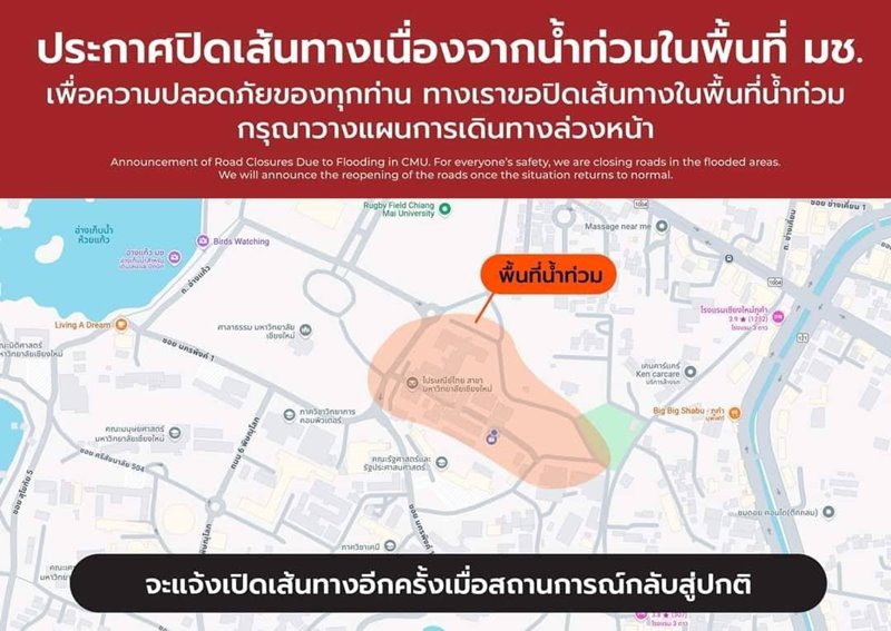 ขณะที่ มหาวิทยาลัยเชียงใหม่ แจ้งประกาศปิดเส้นทางเนื่องจากน้ำท่วมในพื้นที่ รถไม่สามารถสัญจรได้ ประกอบด้วย บริเวณวงเวียนไปรษณีย์ ธนาคารไทยพาณิชย์, สำนักงานมหาวิทยาลัยเชียงใหม่ ส่วนเส้นทางสันอ่างแก้ว มุ่งหน้าไปยังกาดฝายหินได้ และวงเวียนหอนาฬิกา เส้นทางประตู ปตท. ยังสามารถสัญจรผ่านได้