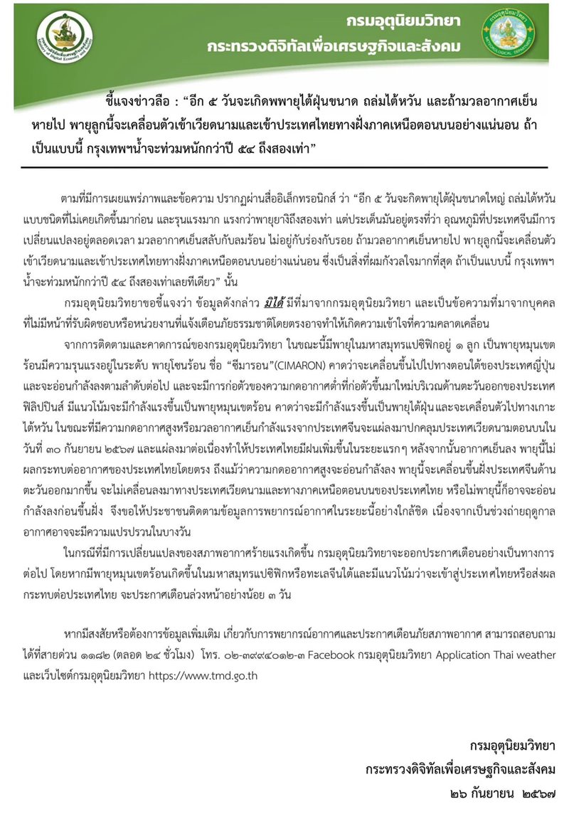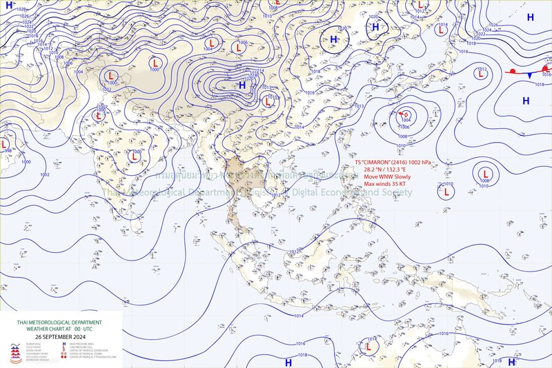 จากการติดตามและคาดการณ์ของกรมอุตุนิยมวิทยา ในขณะนี้มีพายุในมหาสมุทรแปซิฟิกอยู่ 1 ลูก เป็นพายุหมุนเขตร้อนมีความรุนแรงอยู่ในระดับ พายุโซนร้อน ชื่อ "ชีมารอน" (CIMARON) คาดว่าจะเคลื่อนขึ้นไปทางตอนใต้ของประเทศญี่ปุ่น และจะอ่อนกำลังลงตามลำดับต่อไป และจะมีการก่อตัวของความกดอากาศต่ำที่ก่อตัวขึ้นมาใหม่บริเวณด้านตะวันออกของประเทศฟิลิปปินส์ มีแนวโน้มจะมีกำลังแรงขึ้นเป็นพายุหมุนเขตร้อน คาดว่าจะมีกำลังแรงขึ้นเป็นพายุไต้ฝุ่นและจะเคลื่อนตัวไปทางเกาะไต้หวัน ในขณะที่มีความกดอากาศสูงหรือมวลอากาศเย็นกำลังแรงจากประเทศจีนจะแผ่ลงมาปกคลุมประเทศเวียดนามในวันที่ 30 กันยายน 2567 และแผ่ลงมาต่อเนื่องทำให้ประเทศไทยมีฝนเพิ่มขึ้นในระยะแรก ๆ หลังจากนั้นอากาศเย็นลง