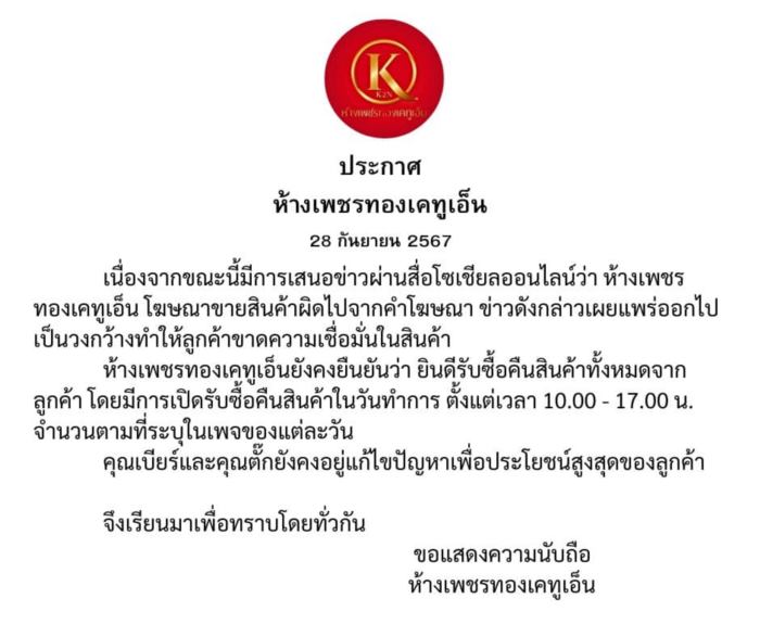ห้างเพชรทองเคทูเอ็นยังคงยืนยันว่า