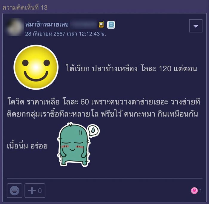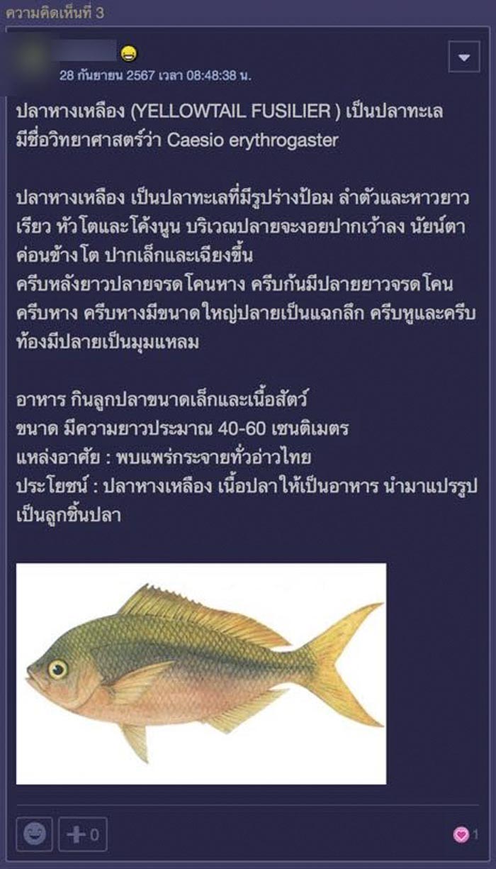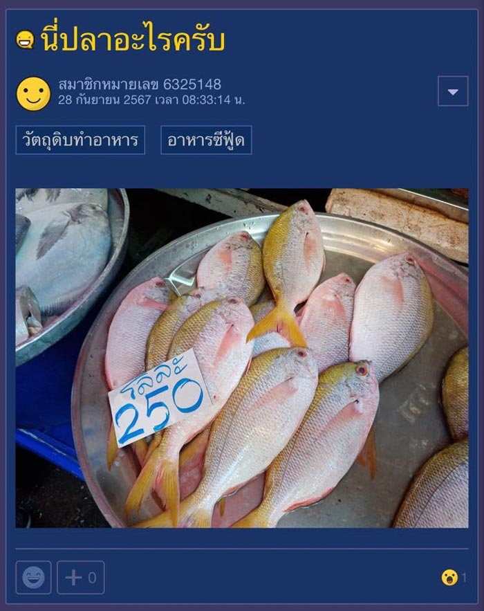 วันที่ 28 กันยายน 2567 สมาชิกหมายเลข 6325148 เว็บไซต์พันทิปดอทคอม ตั้งกระทู้หัวข้อ "นี่ปลาอะไรครับ" เป็นภาพของแผงปลาในตลาด มีการวางขายปลาชนิดหนึ่งในราคาถึงกิโลกรัมละ 250 บาท
