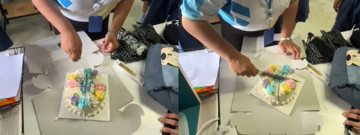 ผู้ใช้ TikTok @dekhongsibsam3.13_crms6 ได้เผยภาพคุณครูสาวท่านหนึ่ง ตัดเค้กวันเกิดแบ่งกับนักเรียนในห้อง 40 คน โดยใช้วิธีตัดเค้กแบบ 800 แฉก เน้นแบ่งเป็นชิ้นเล็ก ๆ เพื่อให้ได้กินกันทุกคน ชาวเน็ตคอมเมนต์ว่า หาวิธีกินเค้กแบบไม่อ้วนได้แล้ว