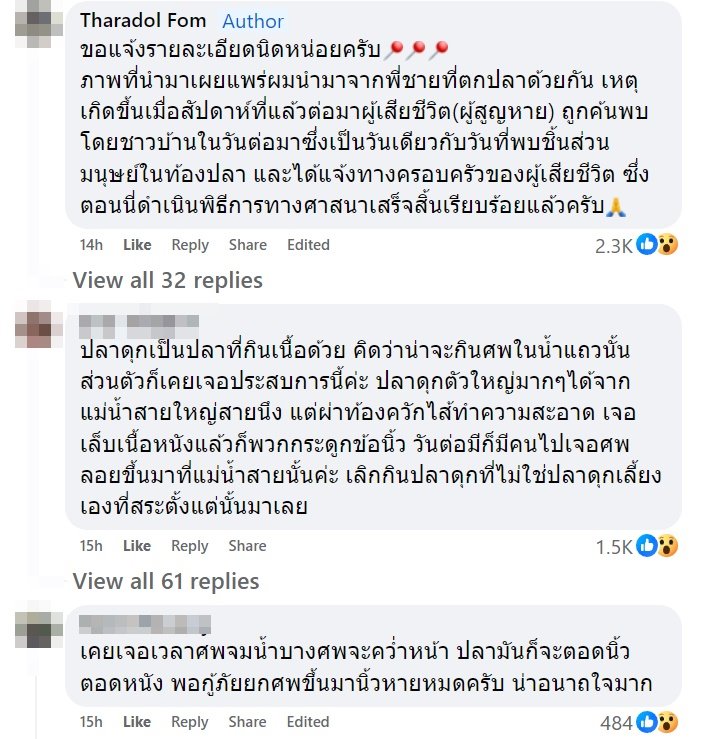 ต่อมา เจ้าของภาพออกมาเล่าเรื่องที่เกิดขึ้นว่า เมื่อสัปดาห์ที่แล้วผมกับพี่ชายไปตกปลาด้วยกัน เมื่อได้ปลามาก็ผ่าท้องแล้วพบชิ้นส่วนคล้ายมนุษย์ ขณะเดียวกันก็มีข่าวว่า ชาวบ้านพบศพอยู่ในพื้นที่บริเวณใกล้เคียง ซึ่งคนนี้เป็นบุคคลสูญหาย ดังนั้นจึงแจ้งทางครอบครัวของผู้เสียชีวิต ดำเนินพิธีการทางศาสนาเสร็จสิ้นเรียบร้อยแล้ว