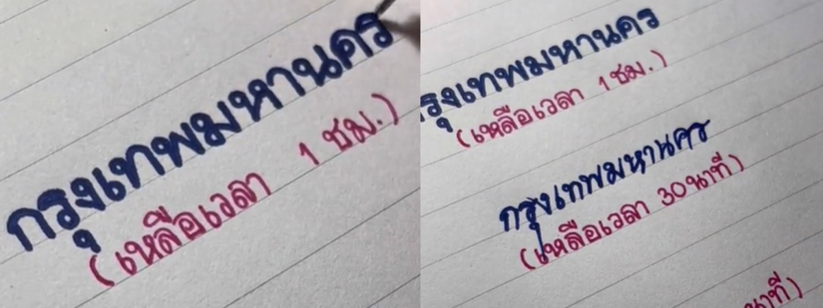ผู้ใช้ TikTok @sugarsugarwrite ได้เผยภาพการคัดลายมือด้วยปากกาเจล พร้อมกำหนดโจทย์ให้คัดคำว่า กรุงเทพมหานคร ตามเวลาที่กำหนด มีตั้งแต่ 1 ชั่วโมงยัน 5 นาที ความพีคอยู่ที่ช่วงคัดลายมือแบบ 5 นาที ต่อให้เขียนลายมือหมอแค่ไหน ก็ยังสวยเหมือนเดิม จนชาวเน็ตแห่ชื่นชมและอยากลายมือสวยแบบนี้บ้าง