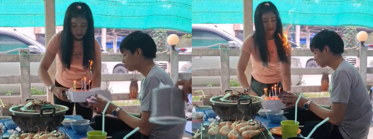 ผู้ใช้ TikTok @janepongmatchot ได้เผยภาพสาวคนหนึ่ง ถือเค้กวันเกิดเซอร์ไพรส์หนุ่ม หน้าเตาหมูกระทะ ไม่รู้ว่าคำอธิษฐานแรงไปรึเปล่า ที่อยู่ ๆ ไฟเทียนก็ไปลุกไหม้โดนเส้นผมเธอ งานนี้แทบดับไฟไม่ทันเลยทีเดียว พากันแตกตื่นทั้งวงหมูกระทะ ชาวเน็ตคอมเมนต์แซวว่า อยู่ ๆ คอนเทนต์ก็พุ่งเข้าหา