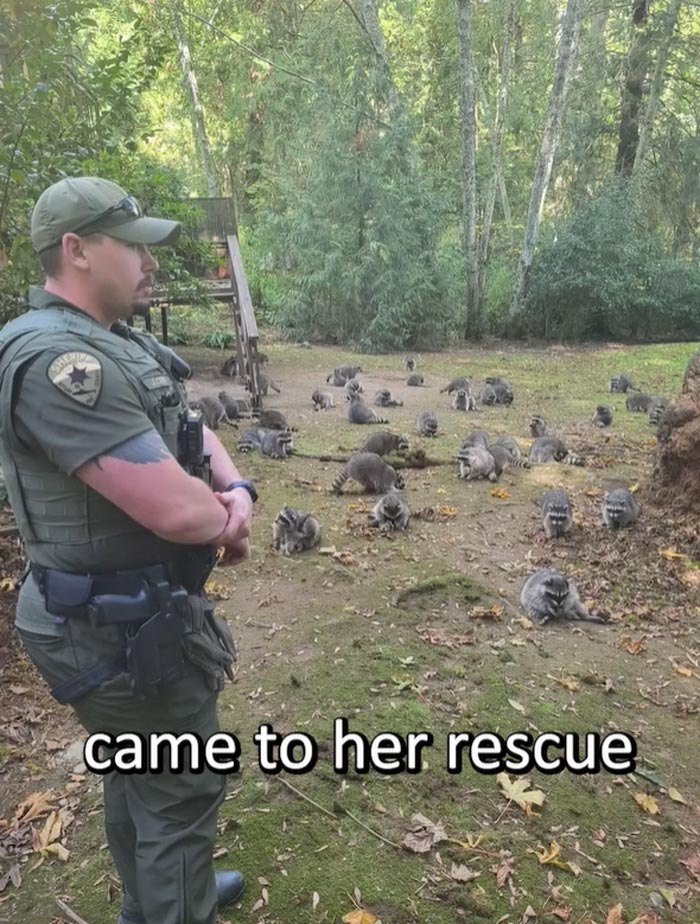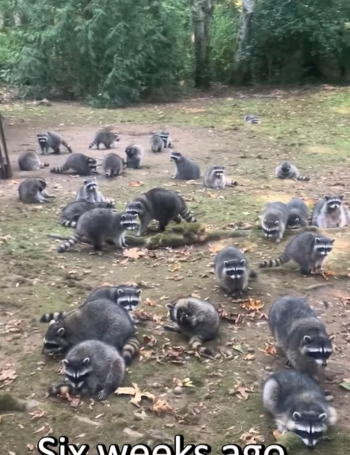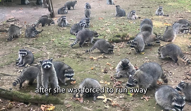 ต่อมา ทางหญิงเจ้าของบ้านเผยว่า เธอได้ให้อาหารแรคคูนที่เคยพบเห็นแถวบ้านมาเป็นเวลานานกว่า 35 ปี โดยแต่ละครั้งก็พบพวกมันจำนวนแค่ไม่กี่ตัว ไม่เคยคาดคิดว่าวันหนึ่งมันจะยกพวกบุกมาล้อมบ้านกว่าร้อยตัว เพื่อเรียกร้องอาหารจากเธอ