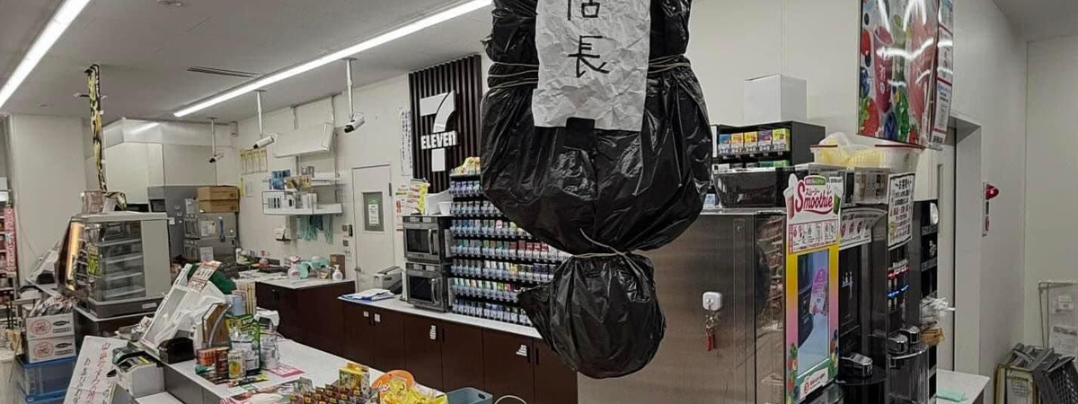 ทวิตเตอร์ @motokichi117117 ได้เผยภาพเซเว่นฯ ที่ญี่ปุ่น ตกแต่งร้านต้อนรับลูกค้าให้เข้ากับช่วงเทศกาลฮาโลวีนที่กำลังมาถึง โดยเอาถุงขยะมาห่อเป็นศพห้อยหัวลงมา พร้อมเขียนป้ายแปะว่า ผู้จัดการร้าน ทำได้สมจริงจนลูกค้าเห็นมีกรี๊ด ไม่อยากนึกภาพตอนปิดไฟจริง ๆ ความหลอนมาเต็มแน่ ๆ
