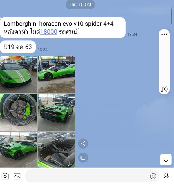 ล่าสุด เฟซบุ๊ก Puvadol Asawanuchit Asawayont ซึ่งเป็นคนเล่นรถหรู ได้ออกมาเผยว่า ก่อนหน้านี้ได้มีนายหน้าทักมาขายรถแลมโบกินี่ ฮูราแคน สีเขียวให้ ซึ่งรถใหม่มาก ไมล์วิ่งแค่ 18,000 และเป็นรถศูนย์ รถคันนี้เป็นรถรุ่นปี 2562 แต่มาจดทะเบียนในปี 2563