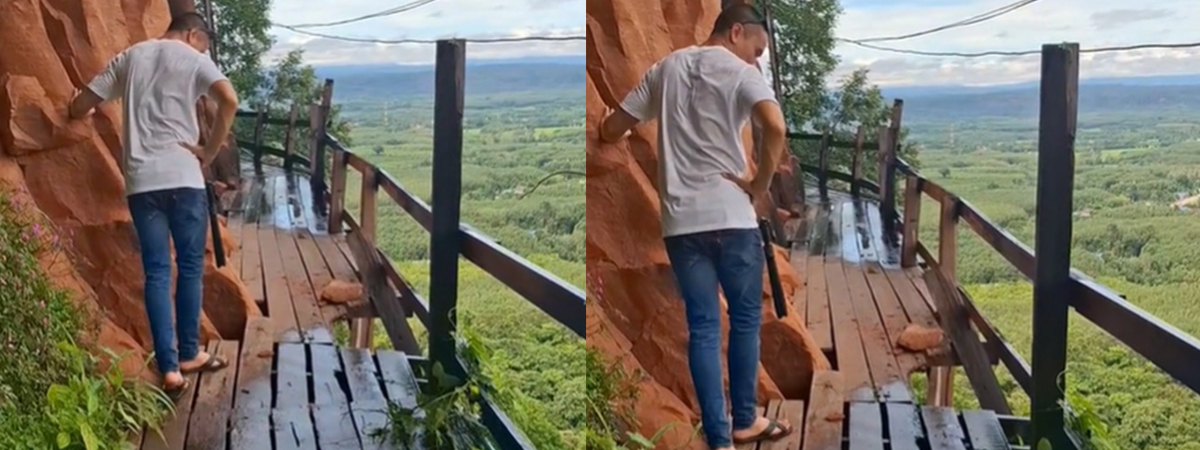 ผู้ใช้ TikTok @jannarongsanongkhun ได้เผยภาพนักท่องเที่ยวหนุ่มกำลังเดินขึ้นวัด กว่าจะไปถึงจะต้องผ่านทางไม้ก่อน แต่ระหว่างนั้นดันเจอทางไม้พัง จะลองเดินต่อไม้ก็โยกเยก เพื่อนเห็นถึงกับรีบบอกให้กลับมา ถ้ายังฝืนไปทางเดิม ก็เหมือนเอาชีวิตไปเสี่ยง เลยยอมเดินย้อนกลับไปเพื่อความปลอดภัย