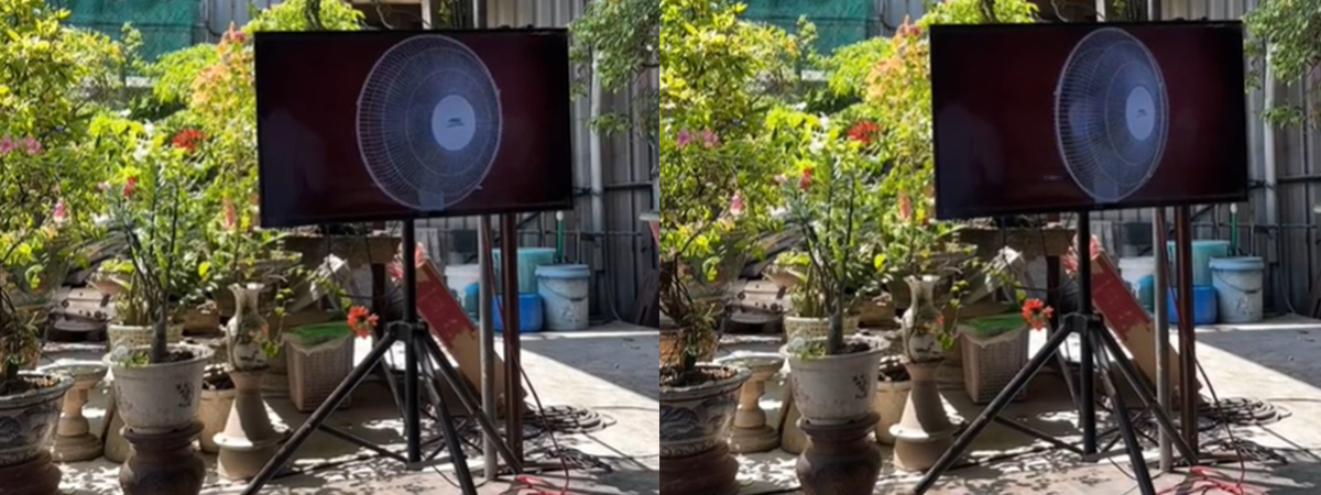 ผู้ใช้ TikTok @banke.toinghe ได้เผยภาพคนเวียดนามท่านหนึ่ง ทนความร้อนของอากาศข้างนอกไม่ไหว เลยเอาพัดลมมาเปิดให้เย็นสบายขึ้น แรก ๆ ไม่เอะใจอะไร แต่พอซูมดูใกล้ ๆ พบว่าที่เห็นนั้นไม่ใช่พัดลม เป็นจอทีวีแล้วเปิดภาพทำเป็นพัดลมหมุนเอา มีความหาทำจนชาวเน็ตแซวว่า เย็นกี่โมง
