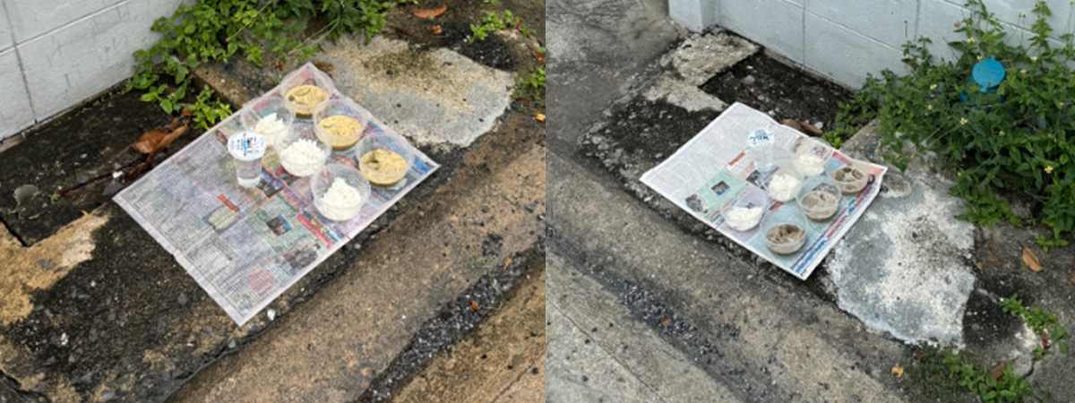 ผู้ใช้ TikTok @thorfah.yuzu ได้เผยภาพเจ้าของบ้านท่านหนึ่ง ออกมาเห็นถ้วยอาหารของใครก็ไม่รู้ พร้อมปูกระดาษหนังสือพิมพ์วางไว้บริเวณหน้าบ้าน คาดว่าต้องมาไหว้ทำพิธีอะไรสักอย่าง จนเจ้าของหมดความอดทน ปล่อยทิ้งไว้ให้มันเน่า ไม่มาเก็บแต่อย่างใด เลยแปะป้ายเตือน ให้ไปไหว้หน้าบ้านตัวเอง ถ้าทำอีกจะแปะรูปประจาน